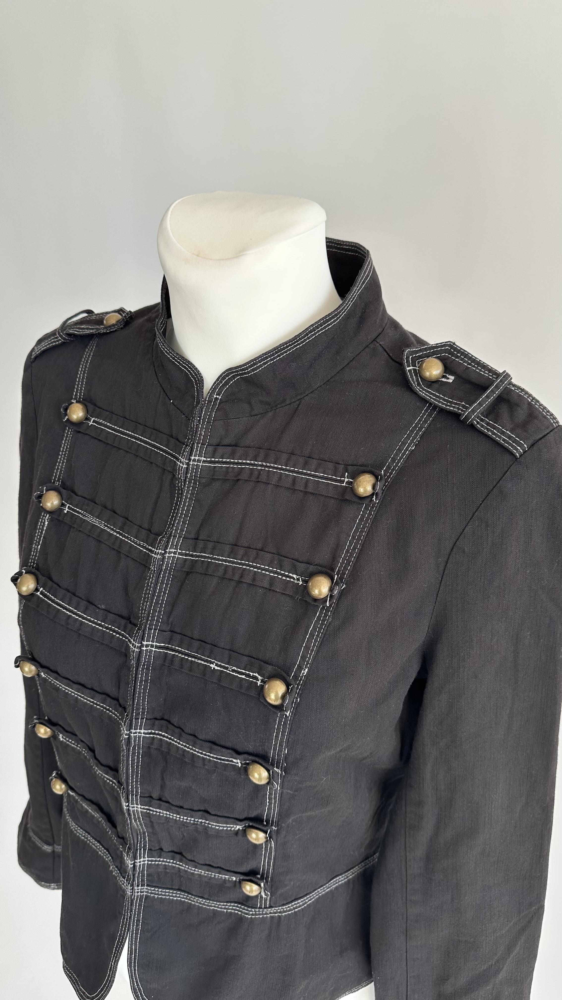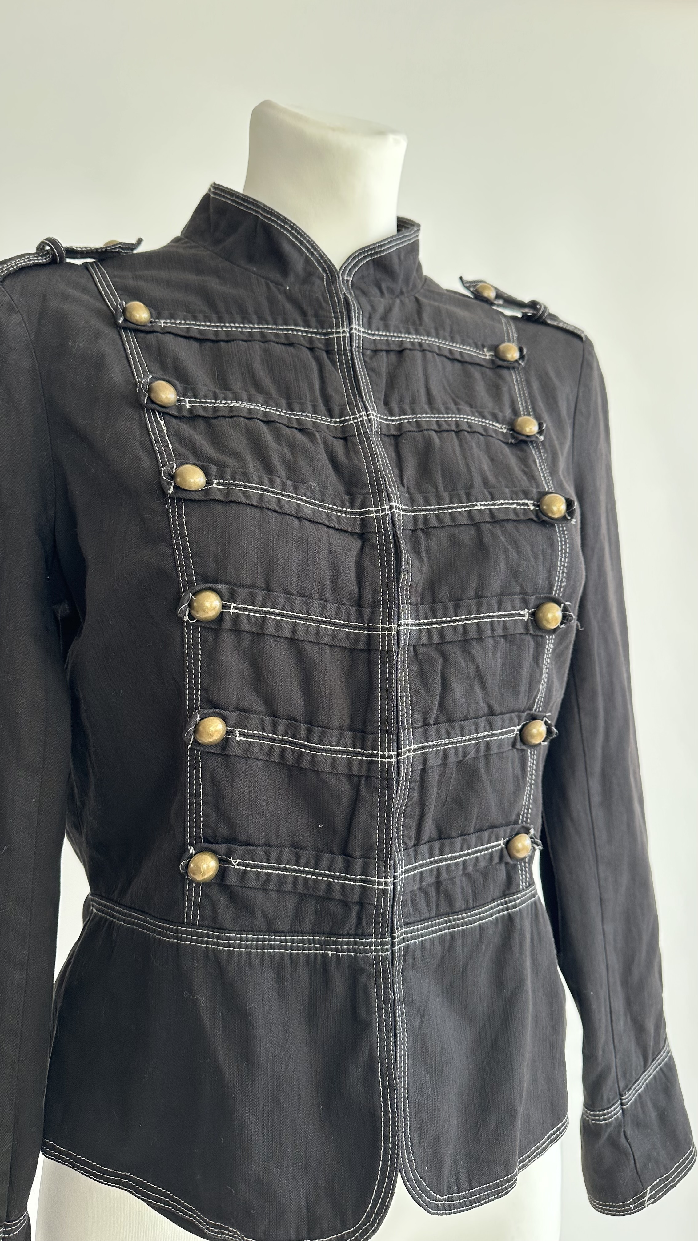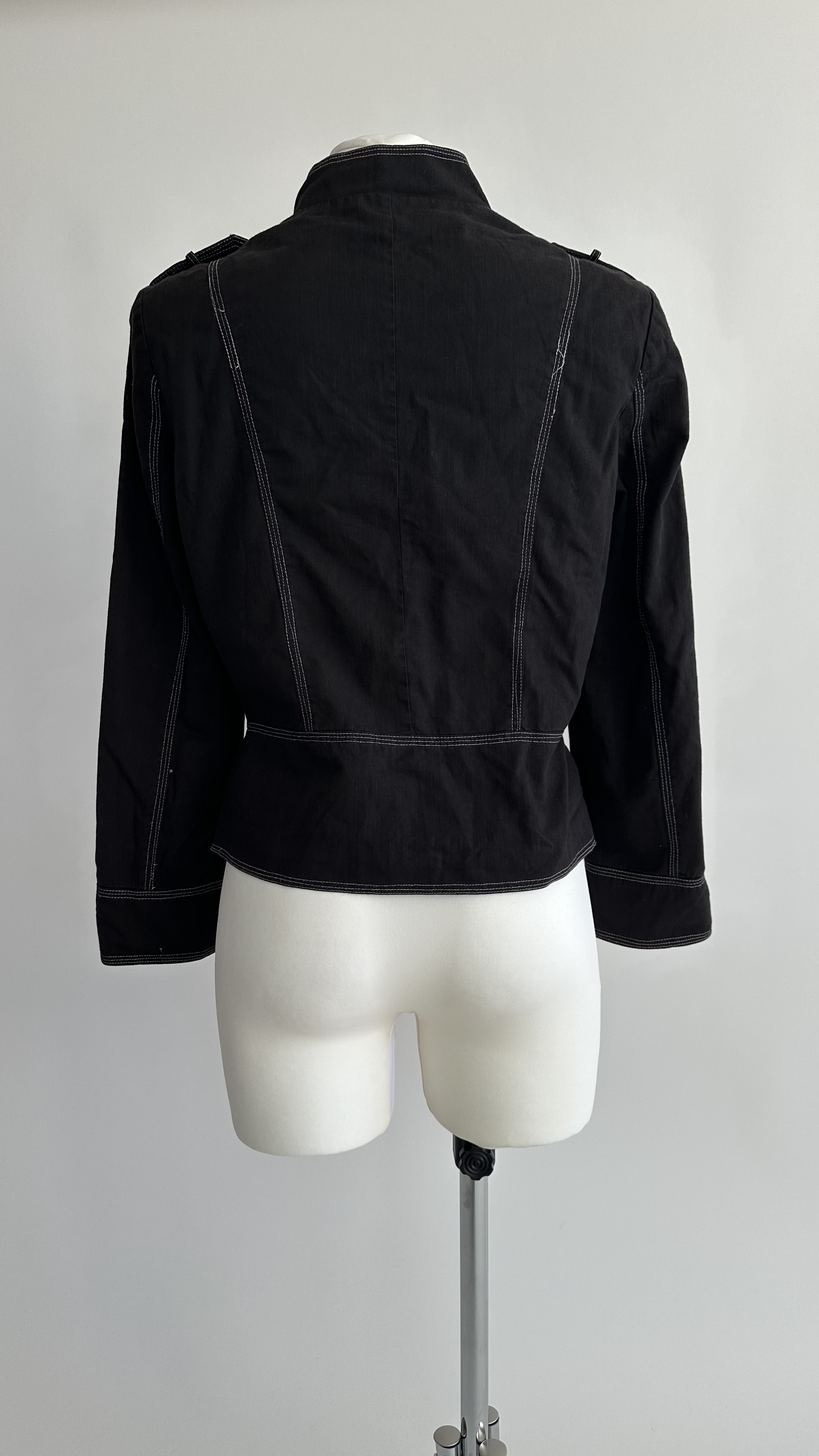 Classic Napoleon jacket by Lindex in size 40, designed in black with striking contrast stitching that highlights the structured, military-inspired cut. The jacket features a high stand collar, decorative horizontal button detailing on the front, and subtle shoulder tabs that enhance its sharp, tailored silhouette. The slightly fitted waist creates a flattering shape while keeping the look strong and confident.